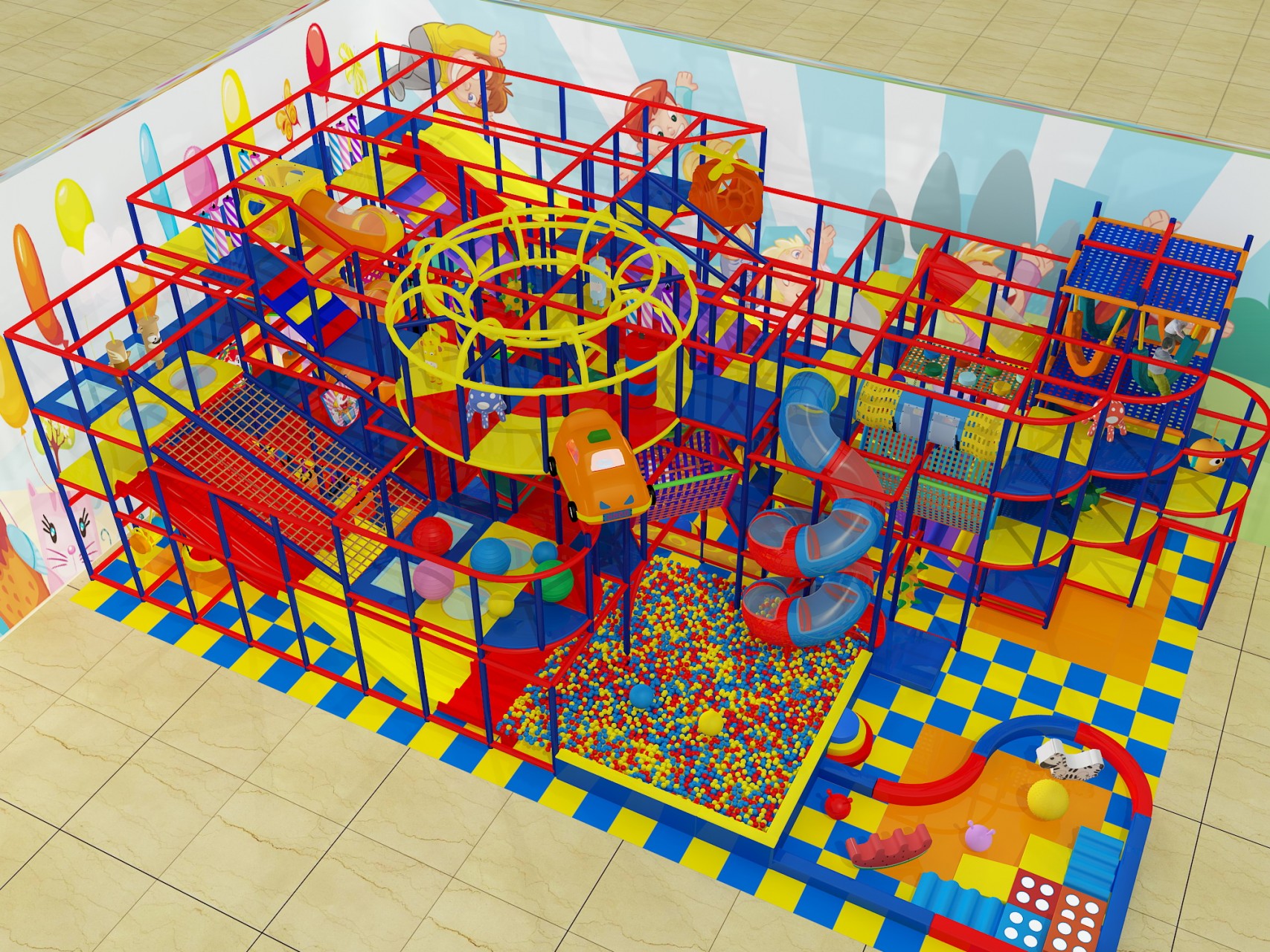 This playground features a playful mixed-theme design with fun characters and bright visuals displayed across all three levels. The layered layout encourages exploration while maintaining open sightlines, making supervision easy for parents and staff.