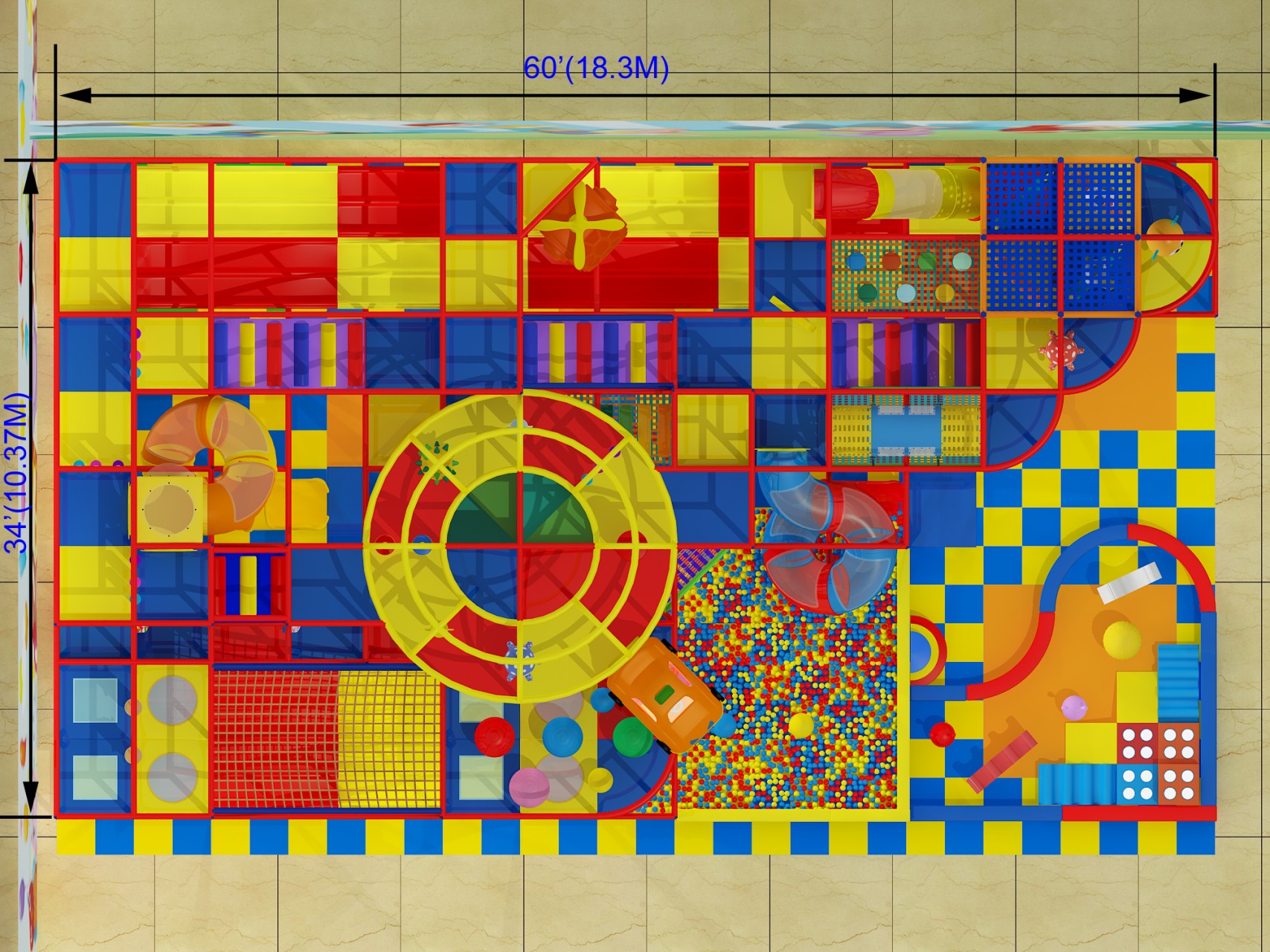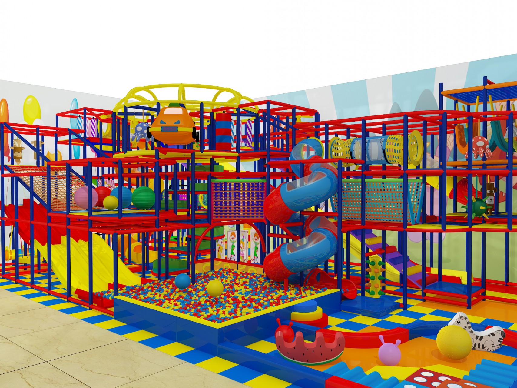 Because of its variety of play zones and mixed-theme design, this playground is ideal for family entertainment centers, indoor playground businesses, and commercial play spaces that want to serve a wide age range.