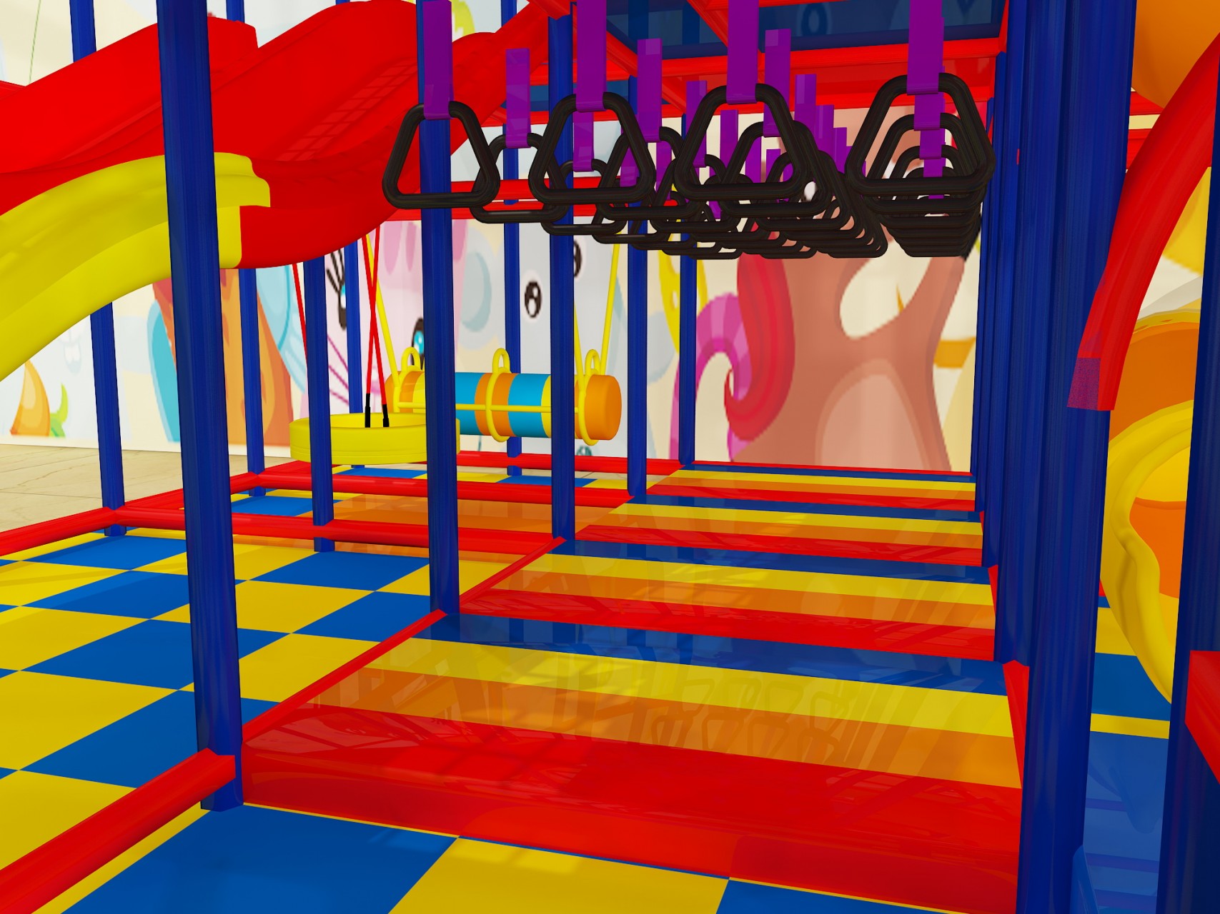 Fun characters and colorful accents appear throughout the playground, helping spark imagination and storytelling during play. While the décor adds excitement, the design remains clean and organized to support safe exploration.