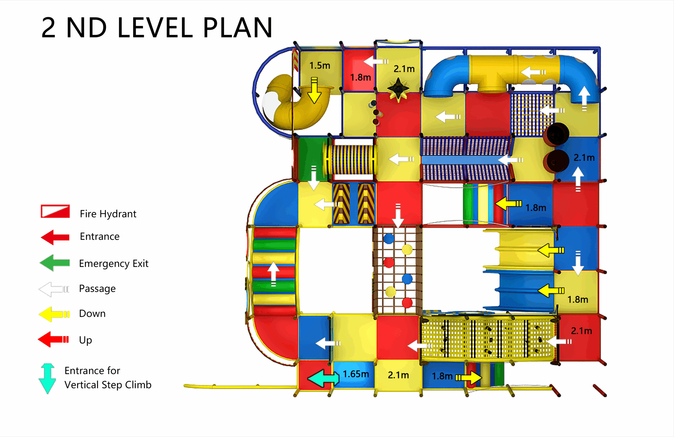 Play Levels – Two interconnected levels linked by ramps, climbing tubes, and enclosed passageways that encourage continuous movement.