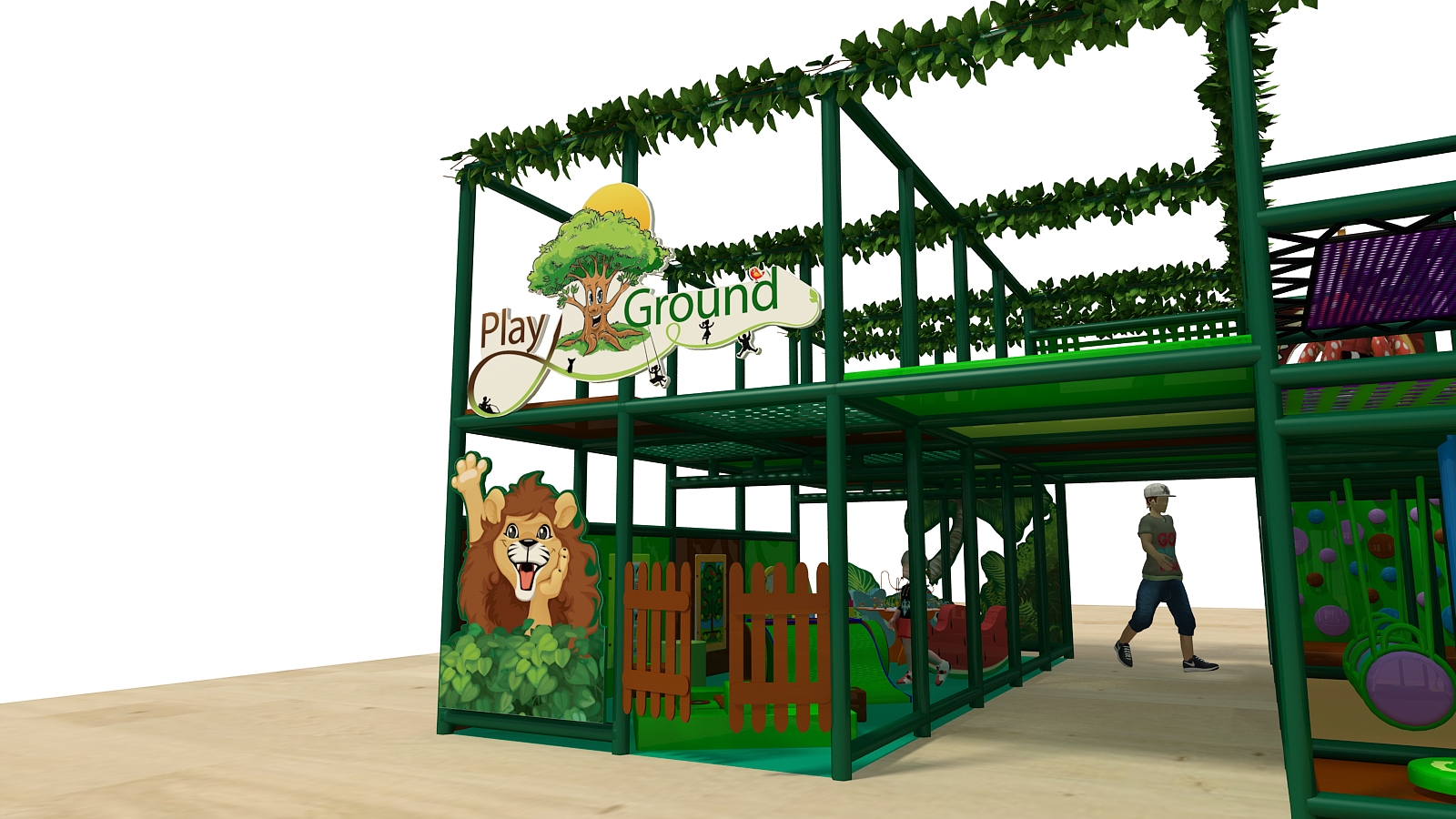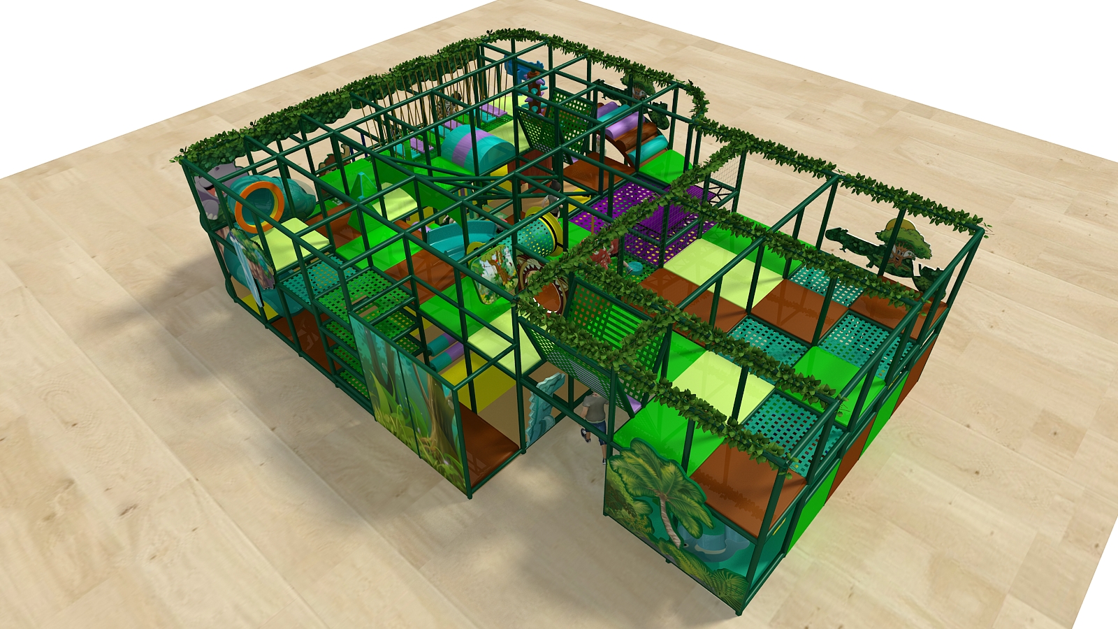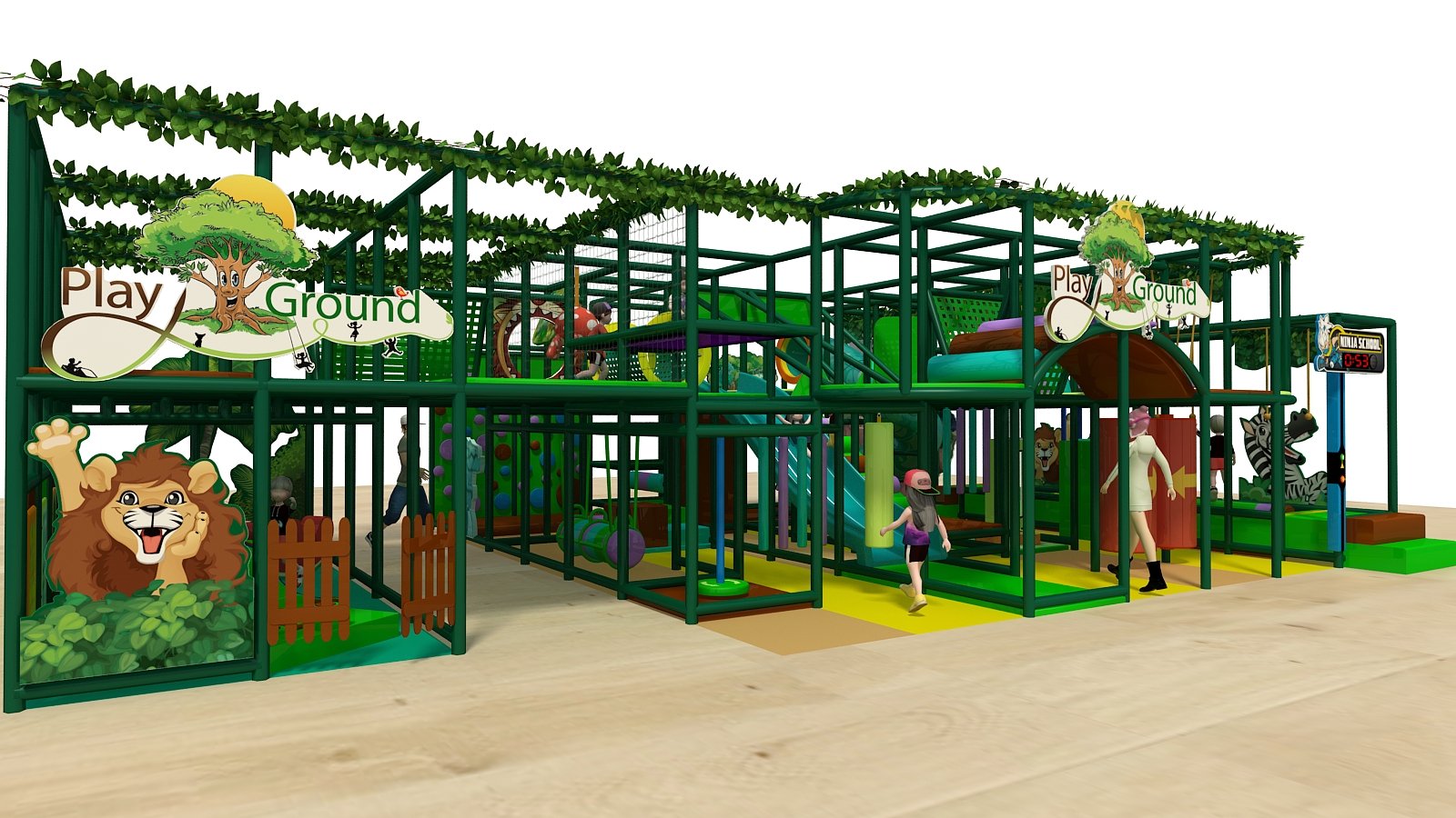 The Custom Brand Jungle Playscape is an action-packed two-level commercial indoor playground designed to deliver a “roaring” good time for children of multiple ages. From the moment kids enter, the jungle theme sets the stage for adventure, movement, and exploration. In addition, the layout combines high-energy play elements with a dedicated toddler area, making it ideal for family-friendly venues.