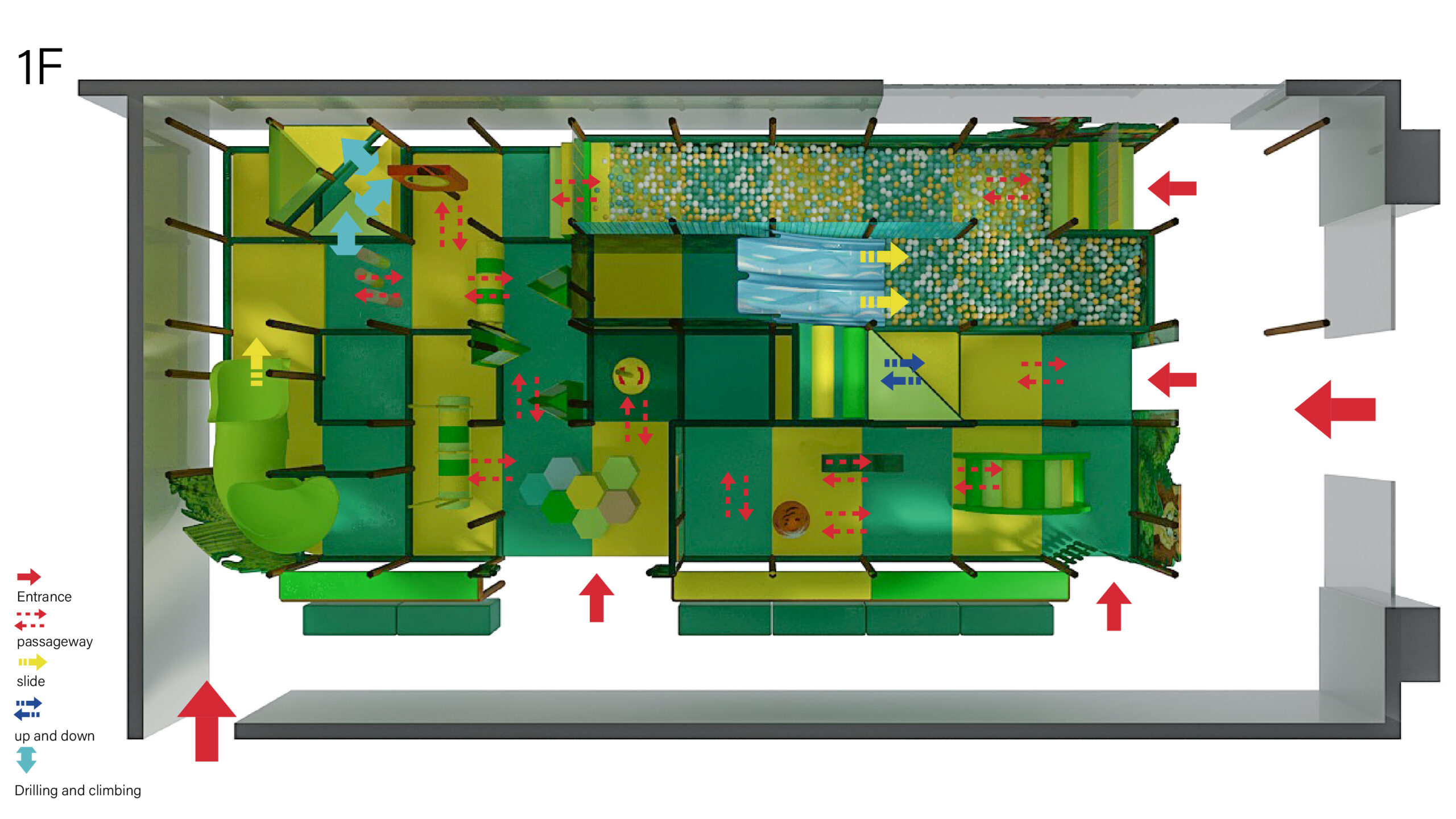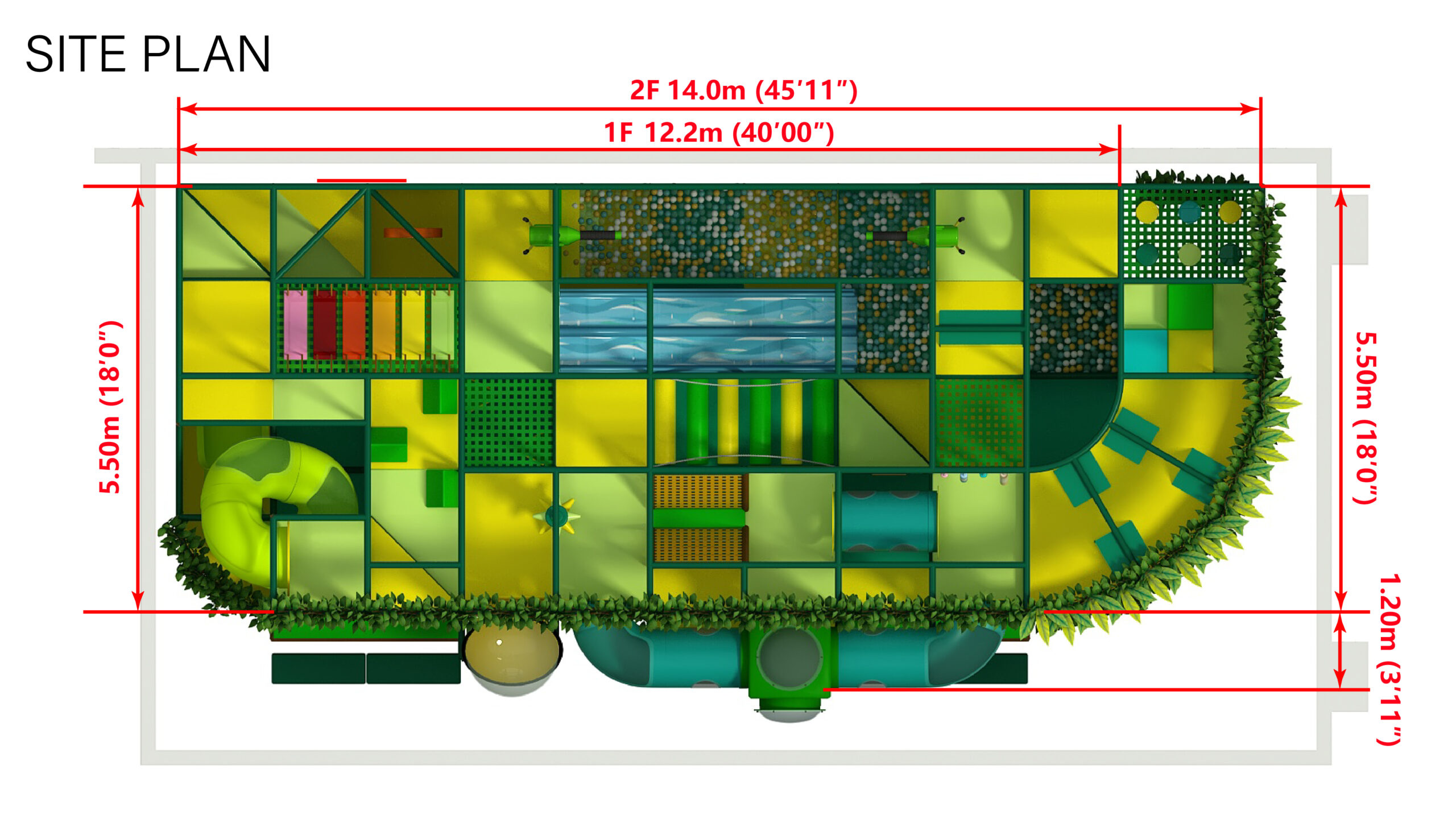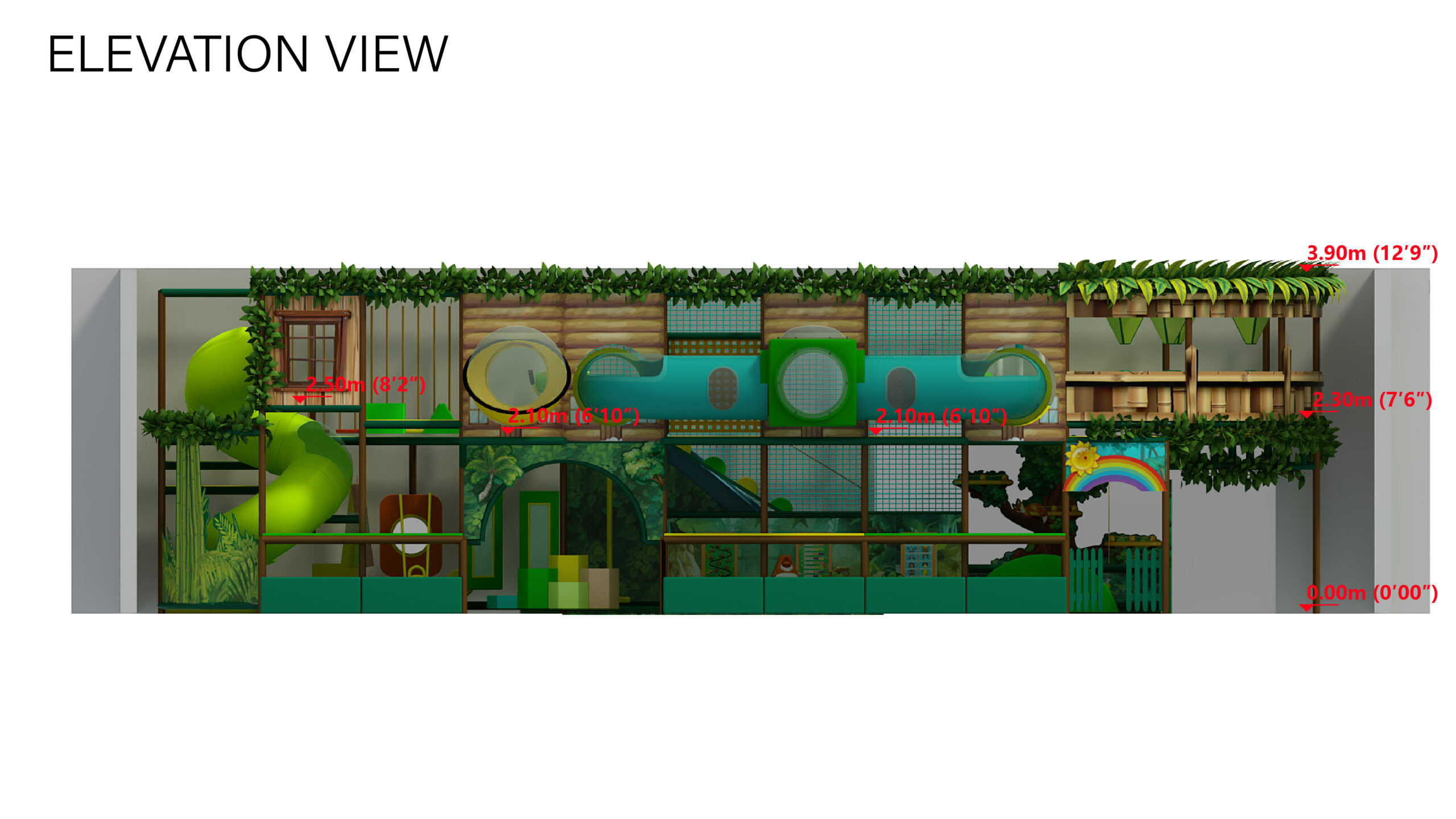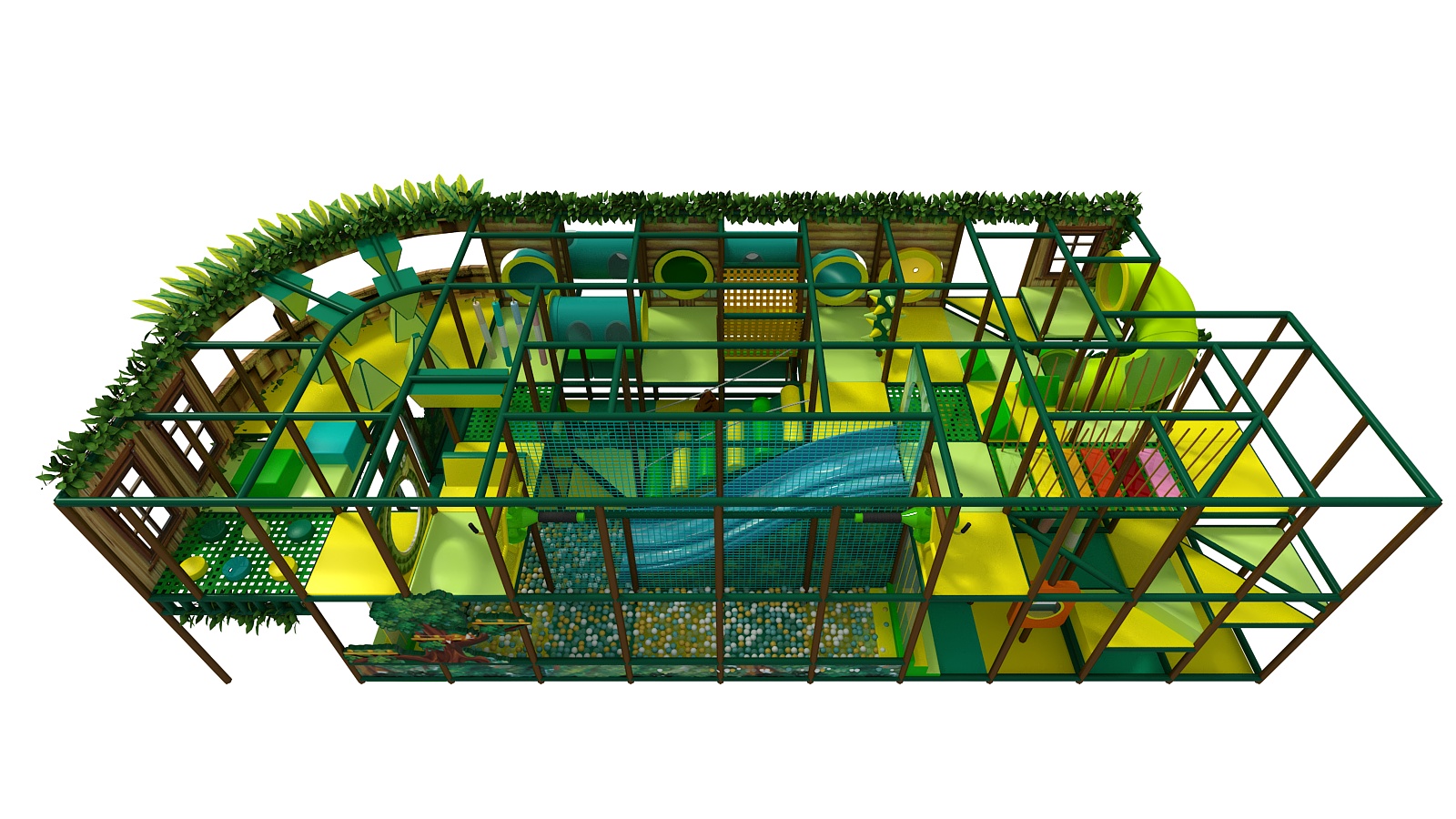 🌿 Two Levels of Adventure – A ground level filled with tunnels, climbing zones, and ball pits leads to an upper level with long slides, obstacle bridges, and lookout areas.