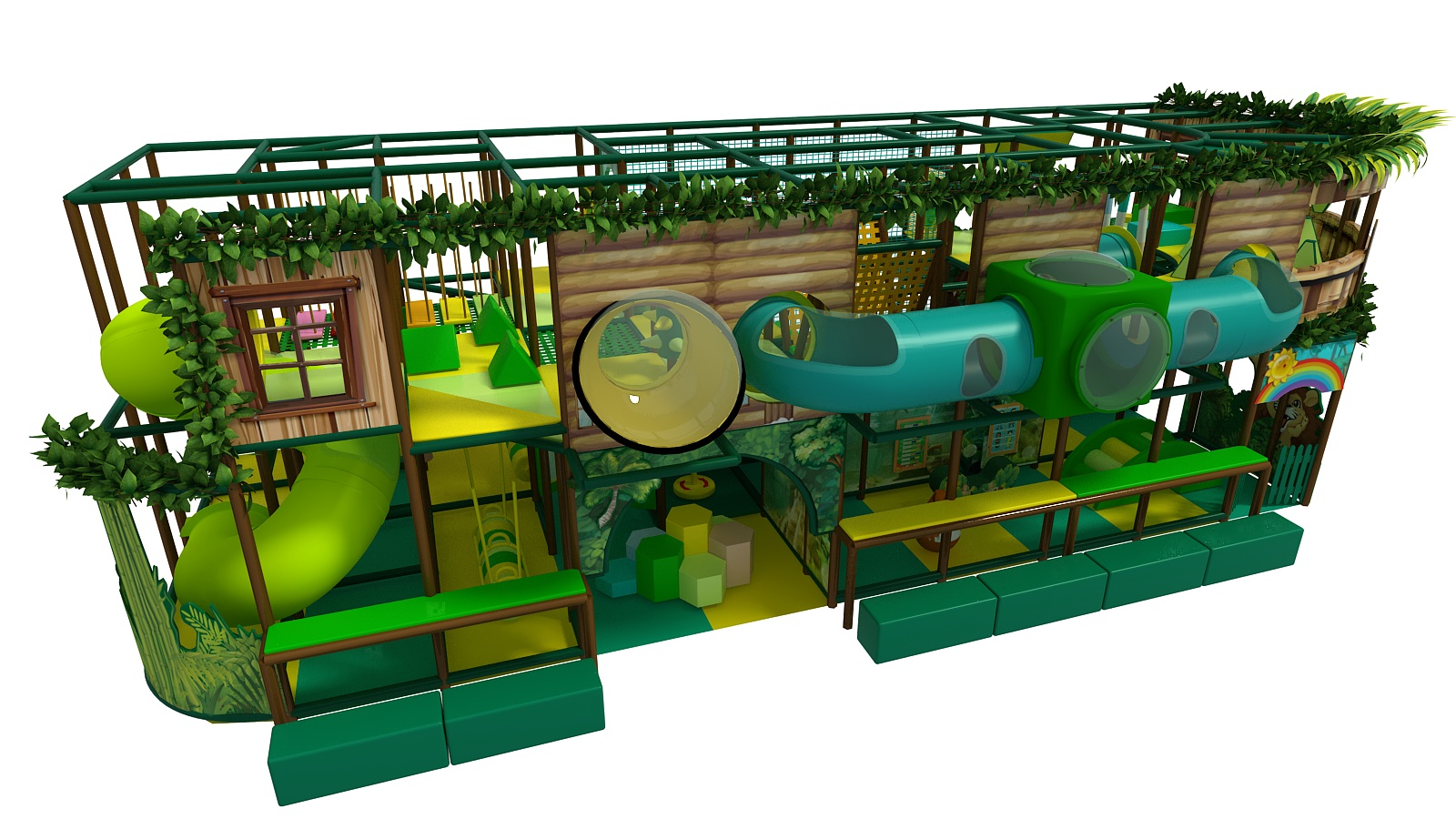 Inspired by lush jungles and treetop hideaways, this playscape features wood-style paneling, leafy accents, and bright jungle colors including rich greens, sunny yellows, and playful pops of blue.