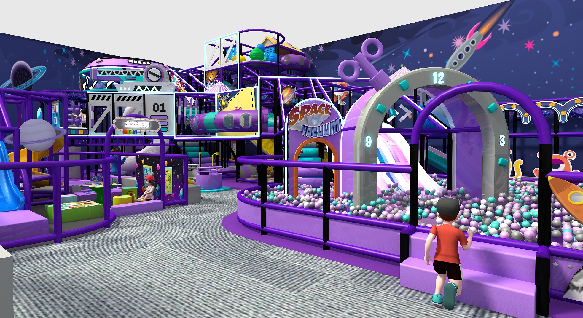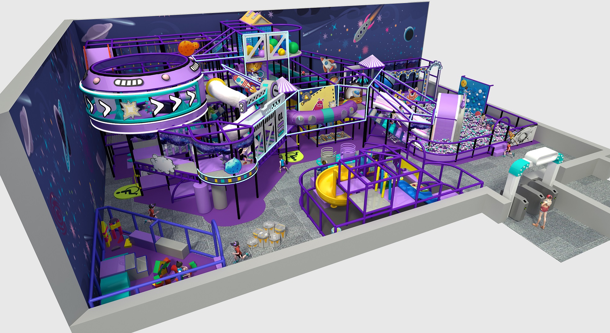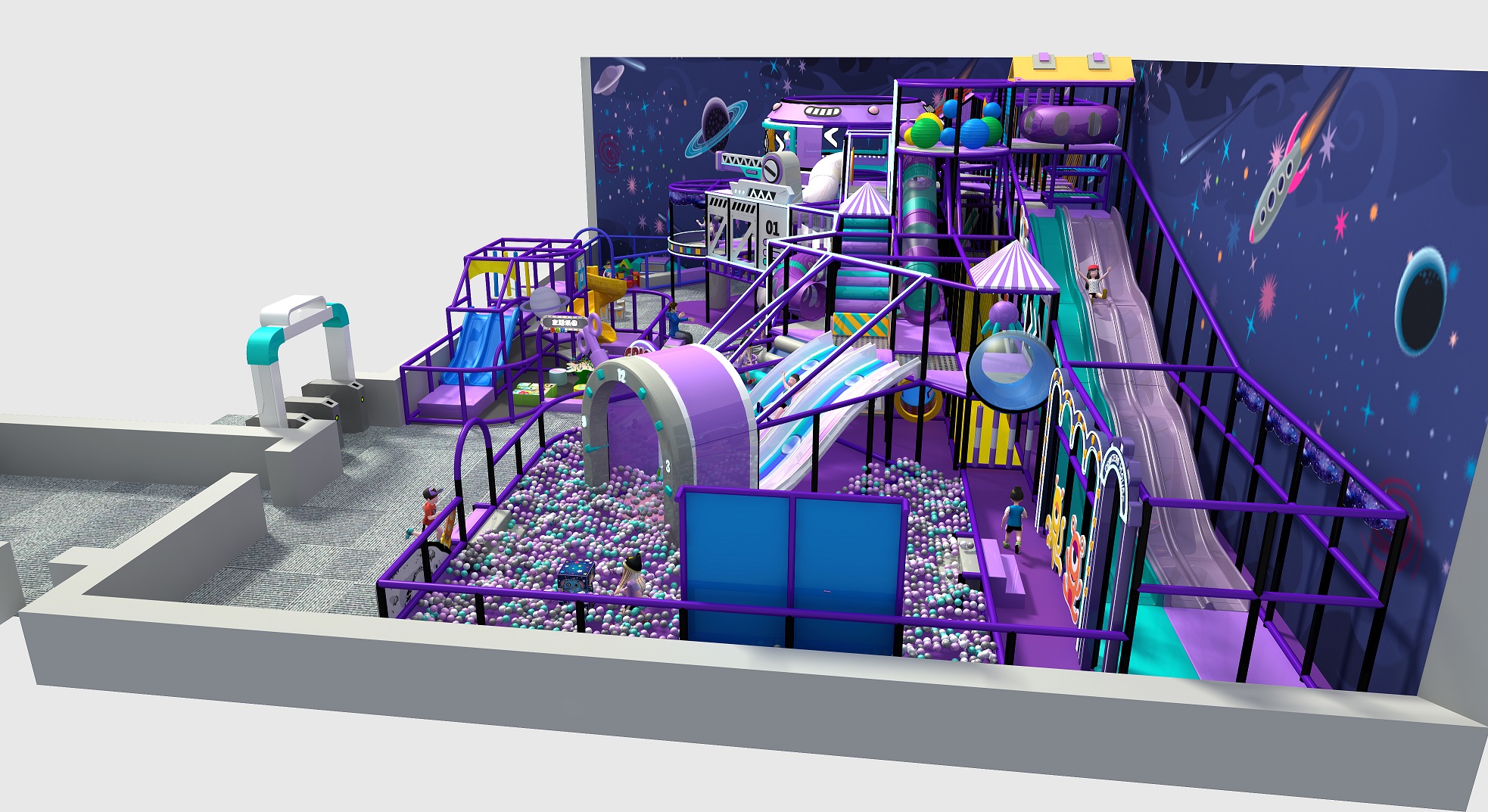 🚀 Space-Station Design – Futuristic shapes, tunnel pods, and elevated platforms create the feeling of docking inside a cosmic play base.