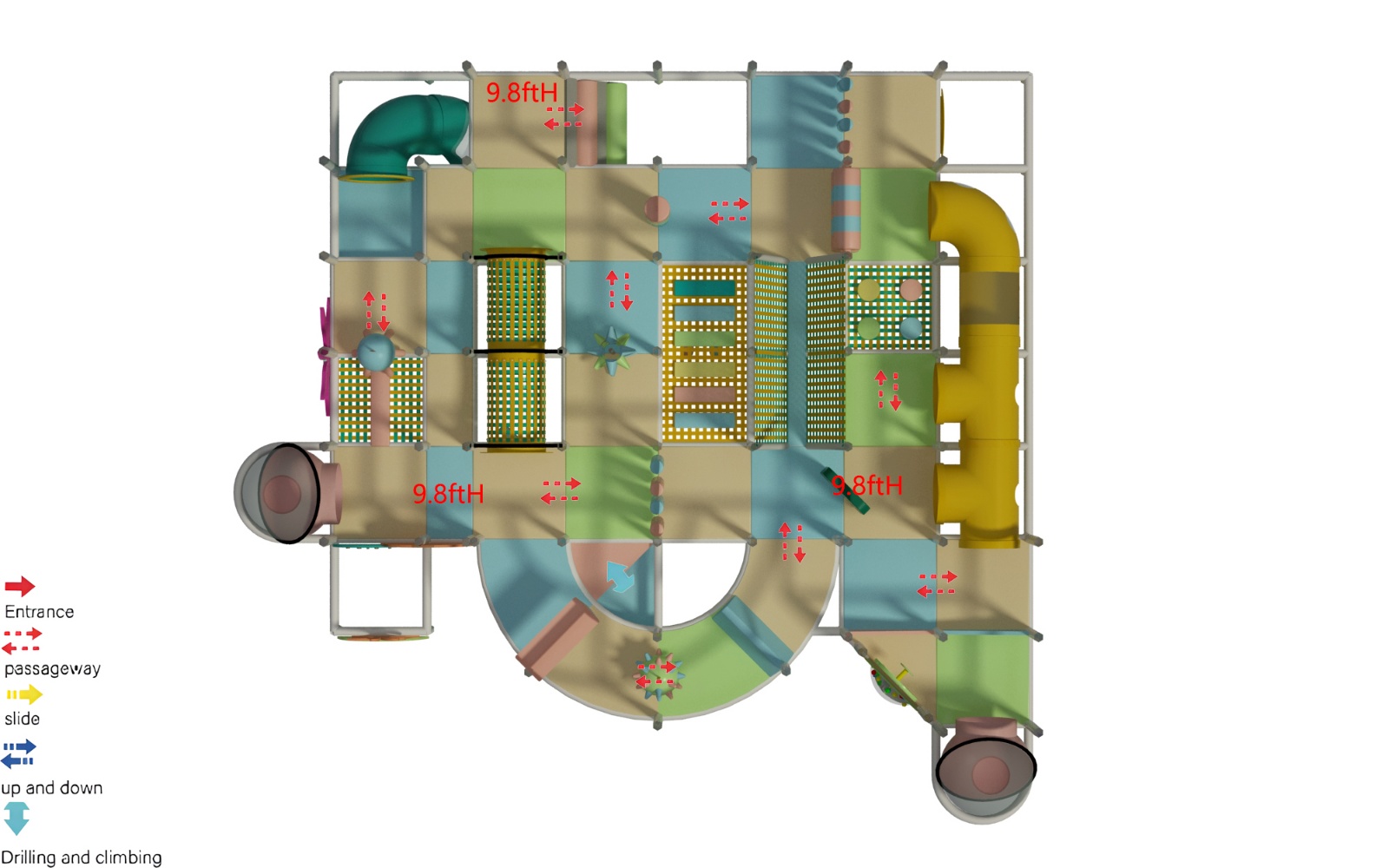 🌀 Crawl Tubes & Tunnels – Enclosed crawl tubes and mesh passageways connect play zones and promote exploration across levels.