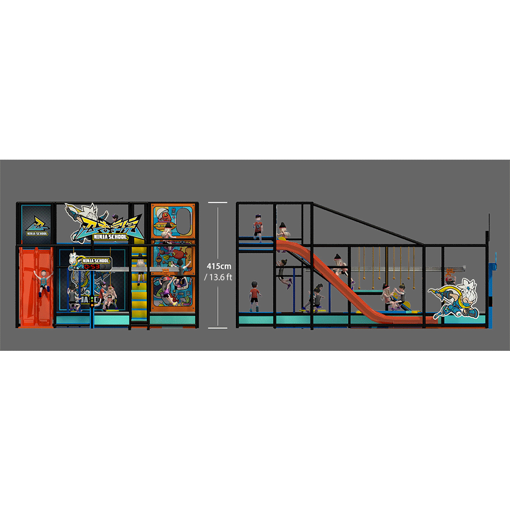 While the design remains clean and athletic, bold colors and dynamic obstacle shapes create an immersive ninja experience. As children move through the course, they feel motivated to push their limits and try again.