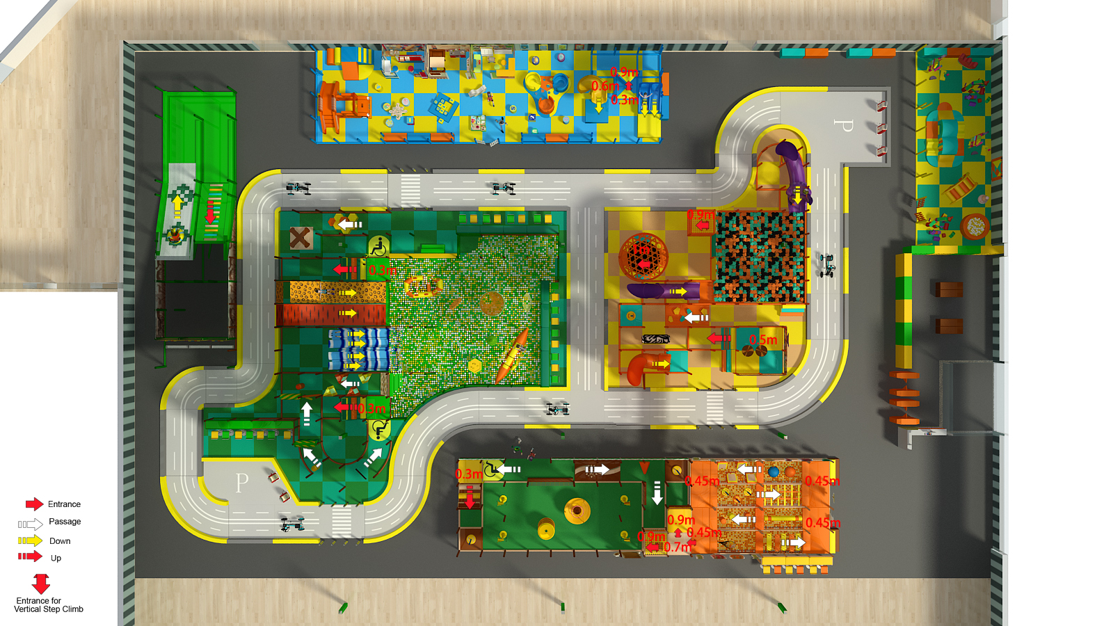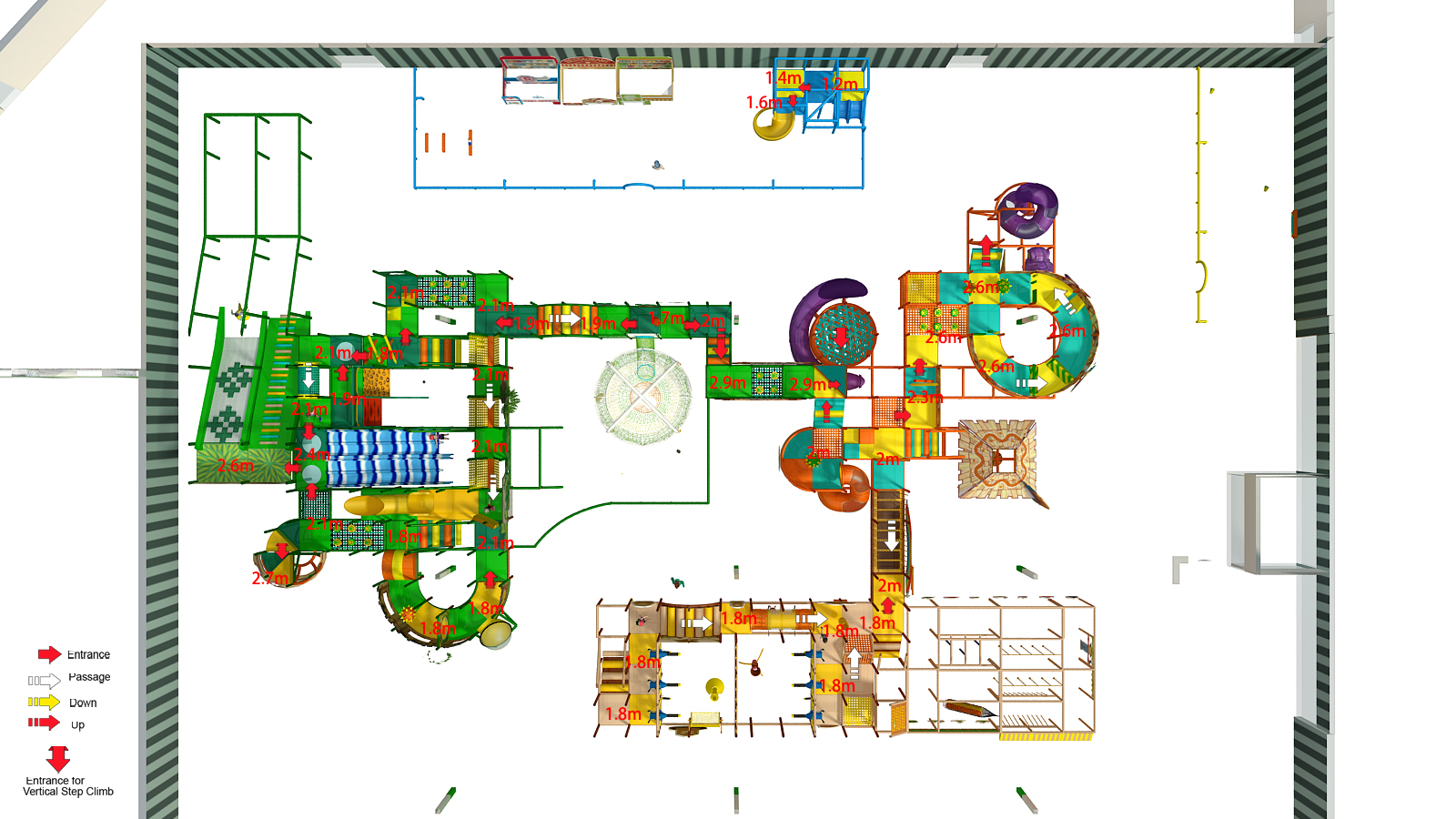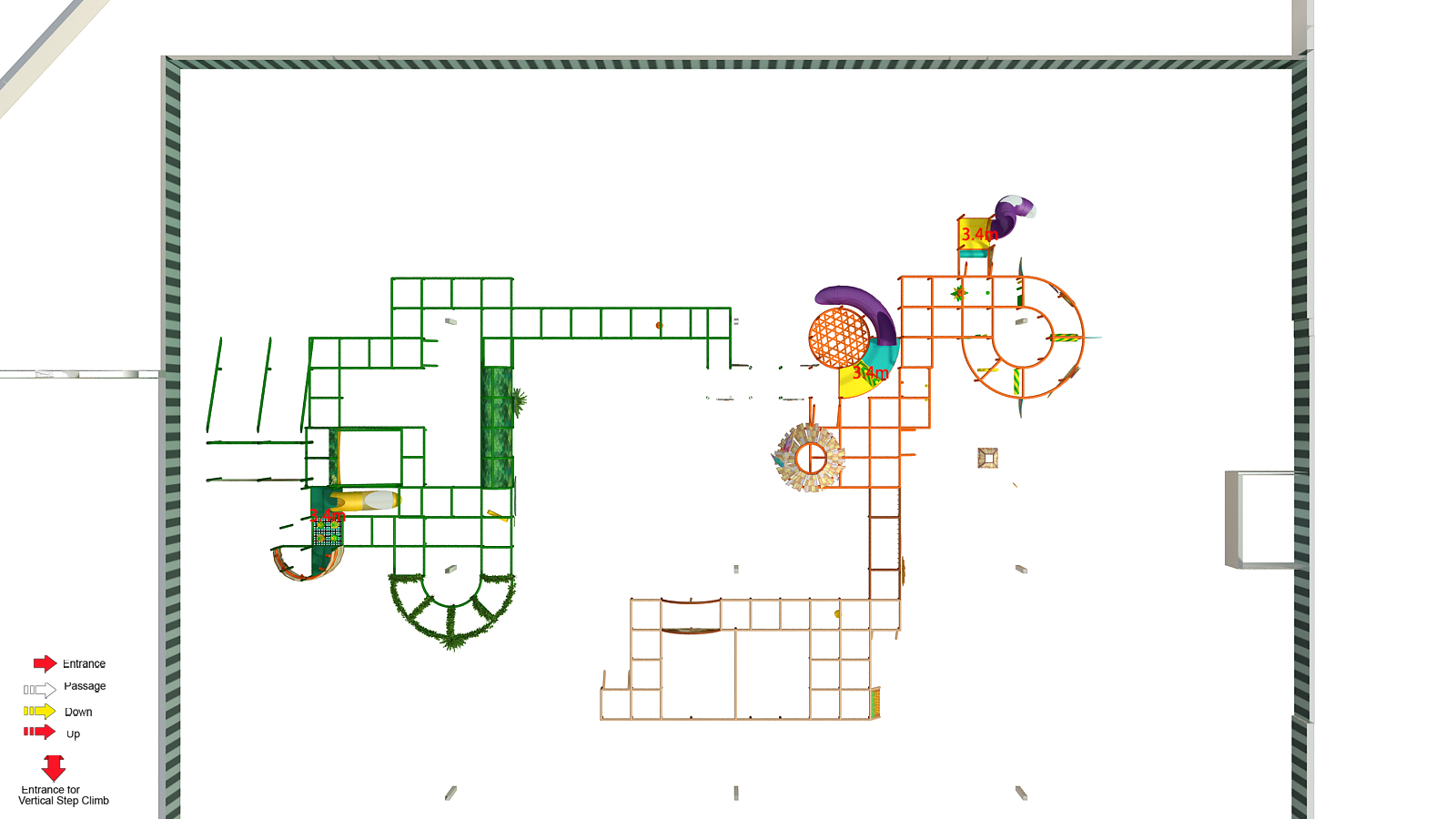🧗 Multi-Level Play Structures – Multiple playgrounds connected across different heights and zones
