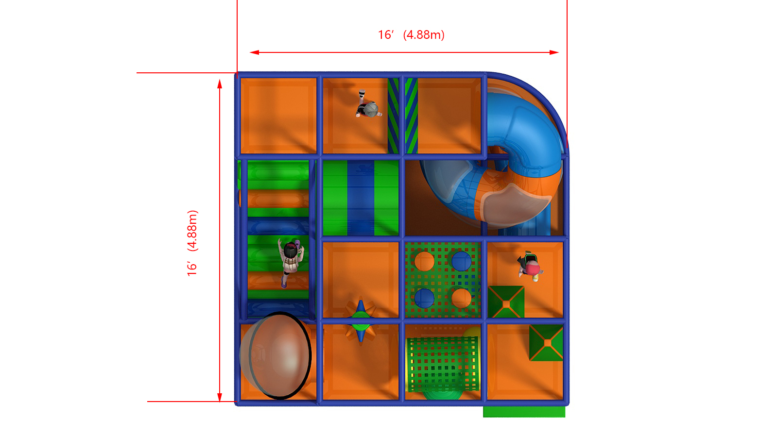 The Small Footprint Tall Indoor Playscape delivers big fun in a compact space. Although it uses only 256 square feet of floor space, it maximizes vertical play with a four-level design. As a result, this playground is ideal for locations with limited floor space but generous ceiling height. Additionally, the structure keeps children active and engaged through climbing, sliding, and exploration.