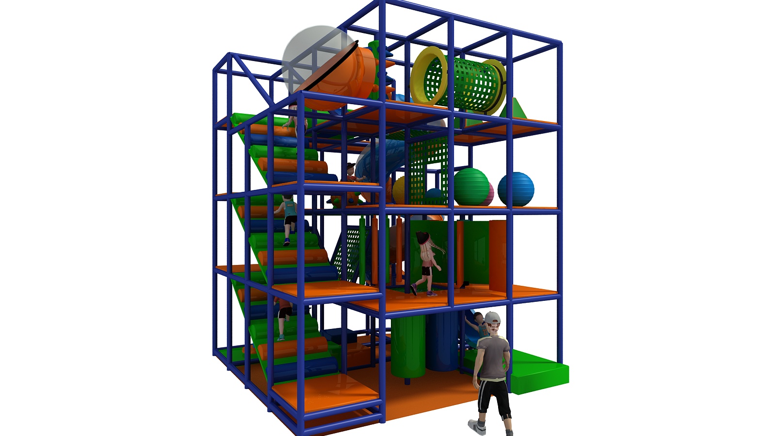 This playscape focuses on vertical adventure and efficient design. Because it stacks play elements upward instead of outward, it creates an exciting experience without overwhelming the space. At the same time, open visibility allows for easy supervision, making it both fun and functional for commercial environments.